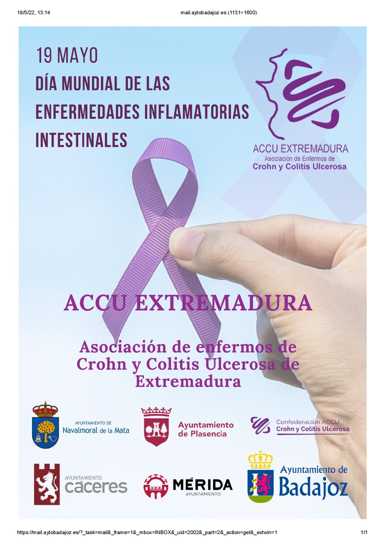 Es por eso que desde ACCU Extremadura (Asociación de Enfermos de Crohn y Colitis Ulcerosa) han realizado este cartel para conmemorar este día y darle de esta forma visibilidad a dichas enfermedades.