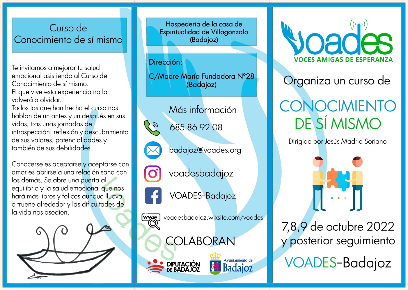 La Asociación Voces Amigas de la Esperanza (VOADES), organiza un curso donde se trabajará el autoconocimiento, la personalidad, relaciones interpersonales, etc. con el objetivo de prepararte y de esta manera poder ayudar a las personas de tu entorno que lo necesiten.